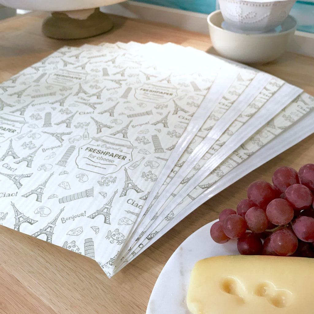 Tired of throwing away cheese that doesn't stay fresh? FreshPaper Cheese Saver Wraps are the natural and simple solution. Infused with organic botanicals proven to keep food fresh for longer, these sheets are designed to wrap around hard and semi-soft cheeses to help keep them fresher longer. They're a food-safe way to help your family's favorite snack go the distance. Your family will thank you, you'll save money, and reduce costly food waste in your own kitchen!